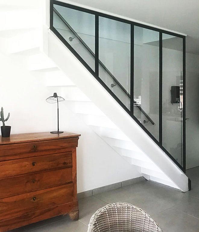 Configaration originale d'une verrière triangulaire servant de garde-corps d'escalier