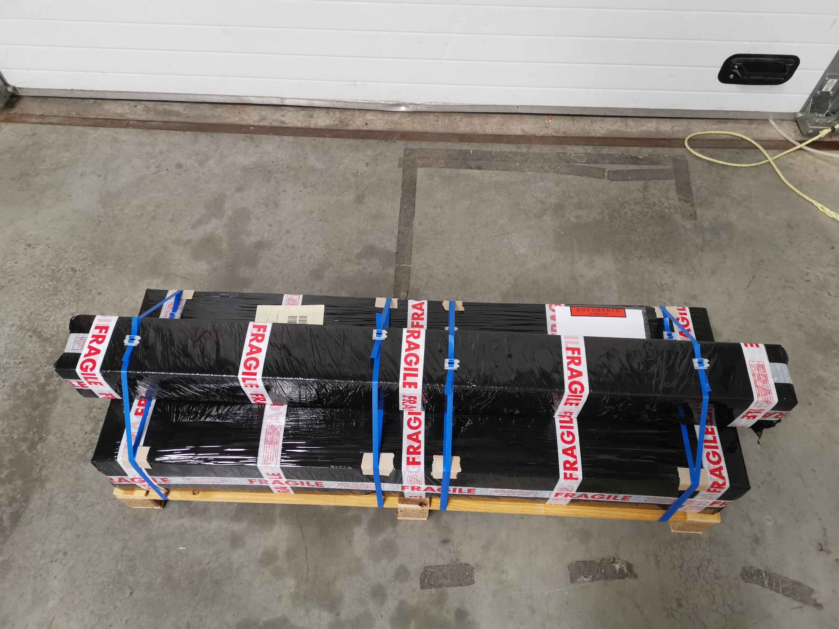 Voici un exemple d'une palette comprenant vitrages et profilés avec notre système d'emballage renforcé :